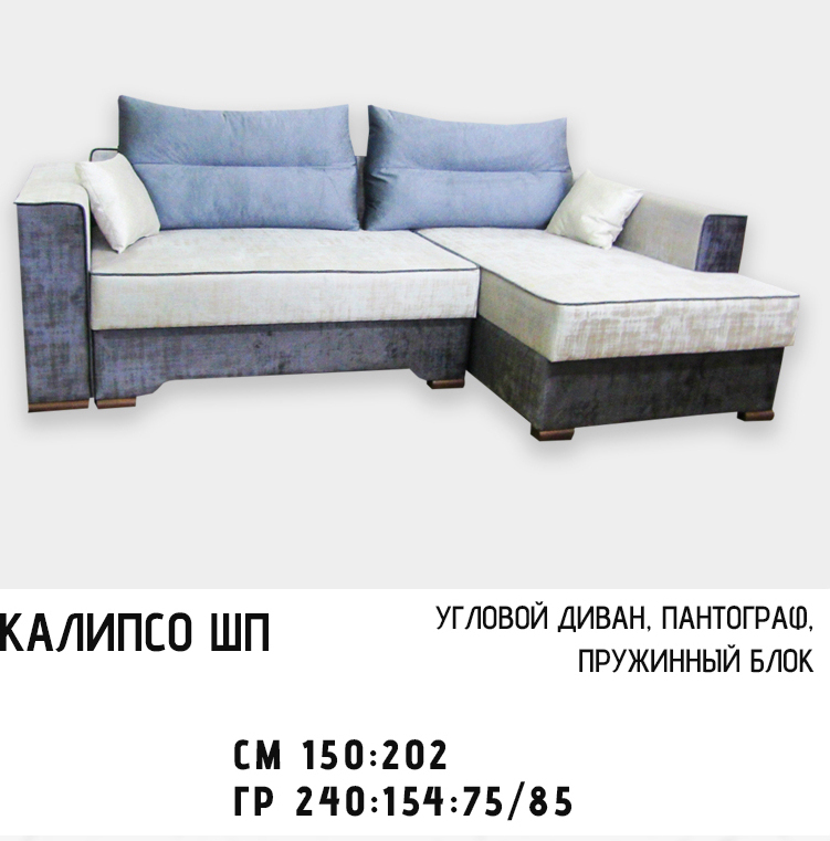 Угловой диван Калипсо представляет собой практичное мебельное изделие с широкими удобными подлокотниками и механизмом трансформации типа «пантограф». Оснащён пружинным блоком системы Боннель, обеспечивающим равномерную поддержку тела во время отдыха.