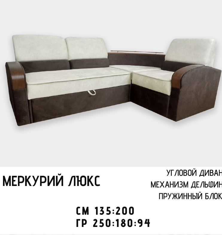 Предлагается приобрести качественный уголок для гостиной «Меркурий Люкс» с механизмом трансформации «дельфин». Модель оснащена пружинным блоком типа «Боннель», обеспечивает комфортный отдых благодаря оптимальному размеру спального места: ширина — 135 см, длина — 200 см. Габаритные размеры изделия составляют 250×180 см. Широкий ассортимент тканей позволяет выбрать наиболее подходящий вариант покрытия. Консультации по вопросам приобретения предоставляются квалифицированными специалистами компании.