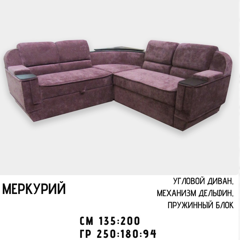 Угловой диван «Меркурий», оснащённый механизмом трансформации типа «дельфин», обеспечит дополнительное пространство для отдыха и сна. Конструкция оборудована ортопедическим блоком пружин «Боннель». Габариты изделия — 250×180 см, размеры раскладного спального места составляют 135×200 см. Обивка доступна в различных вариантах тканей на выбор заказчика. Для уточнения деталей обращайтесь к нашим менеджерам.