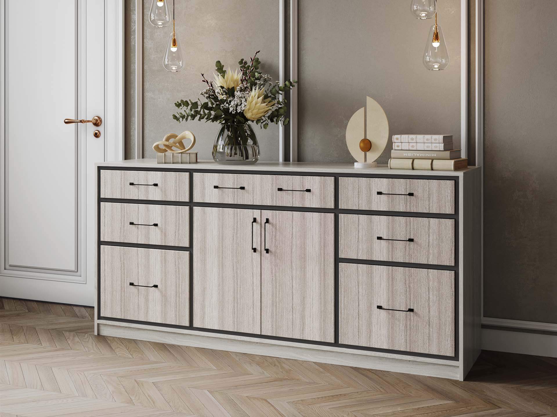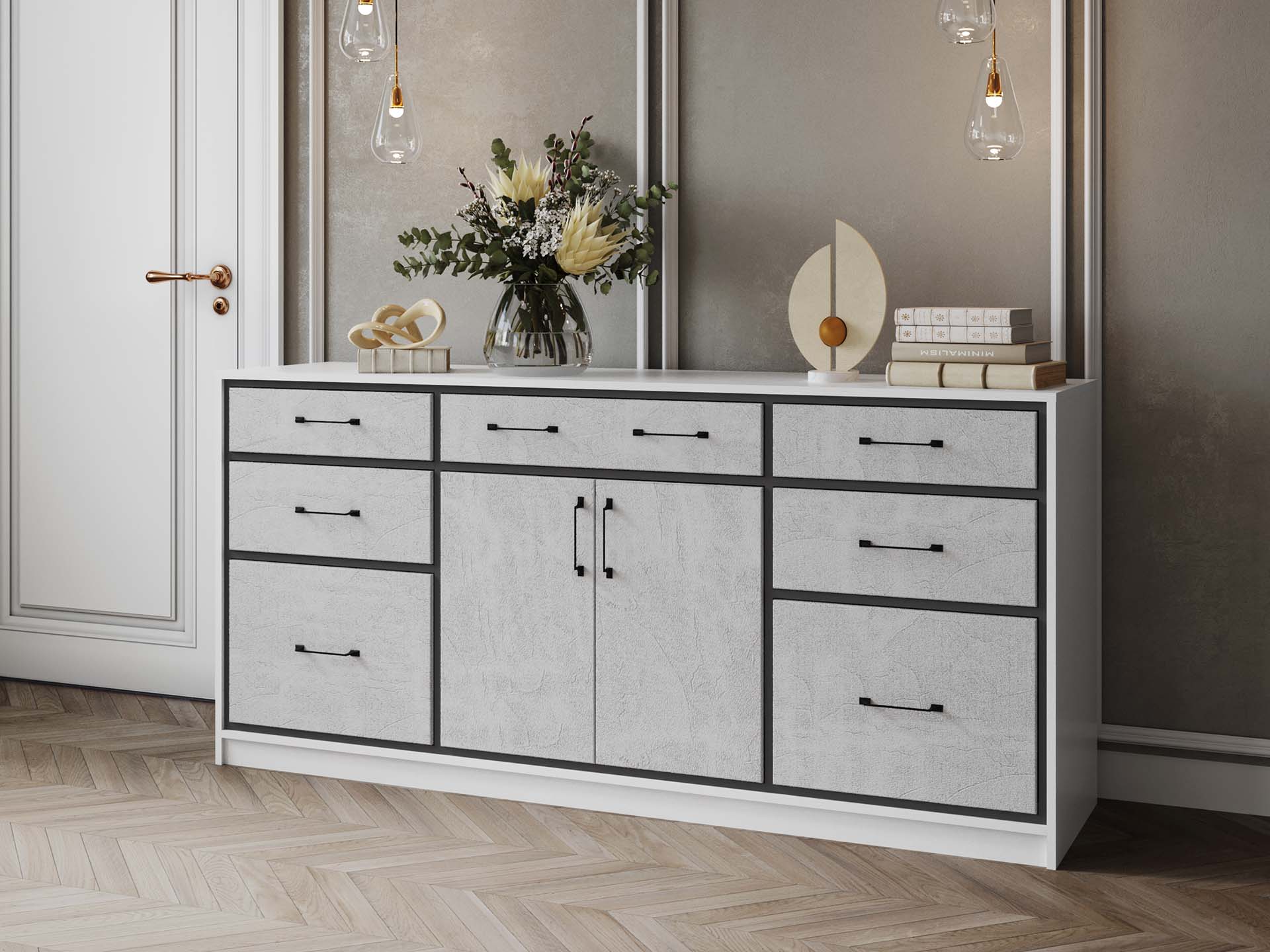 Вариант-14: ЛДСП Белый с тиснением «Древесные поры»/ МДФ ПВХ Камень Светлый Акцентная кромка — Графит Серый