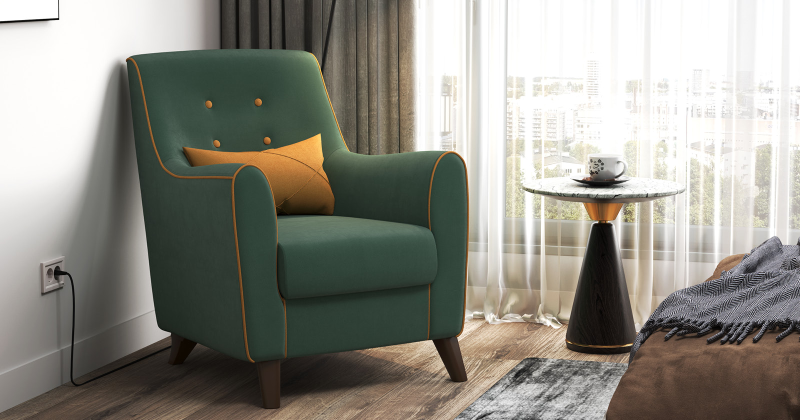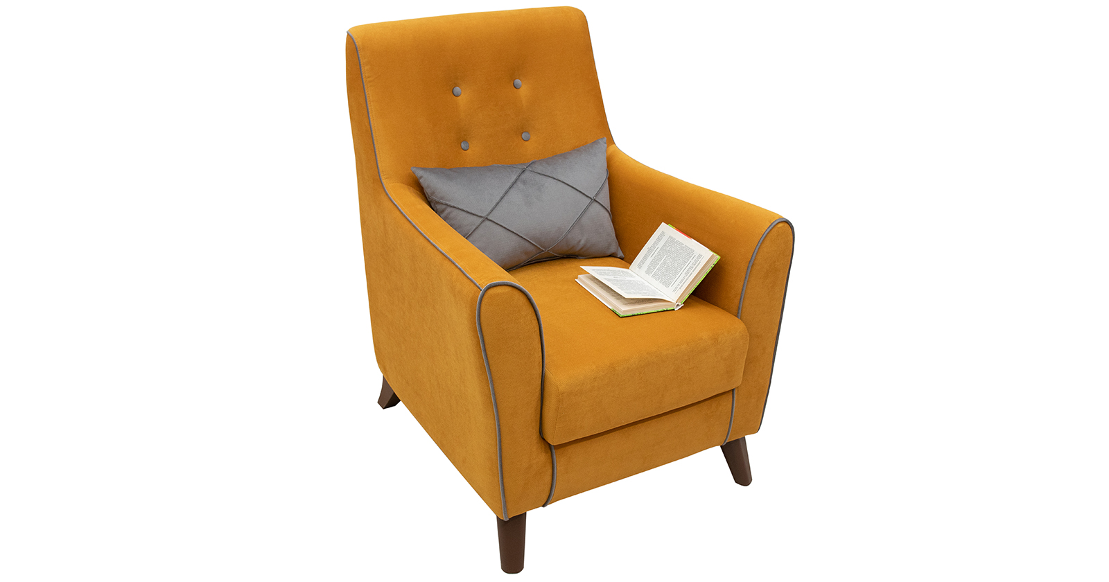 Декоративный кант на кресле, защипы на декоративной подушке, пуговицы на спинке.