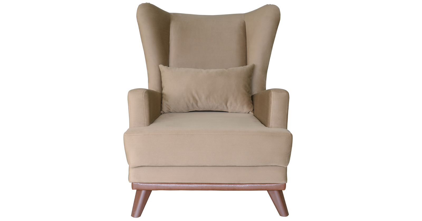 Высокая спинка с наклоном и мягкие подлокотники обеспечивают удобную посадку, дополнительный комфорт создает декоративная подушка. Царга кресла обтянута искусственной кожей в цвет опорам.